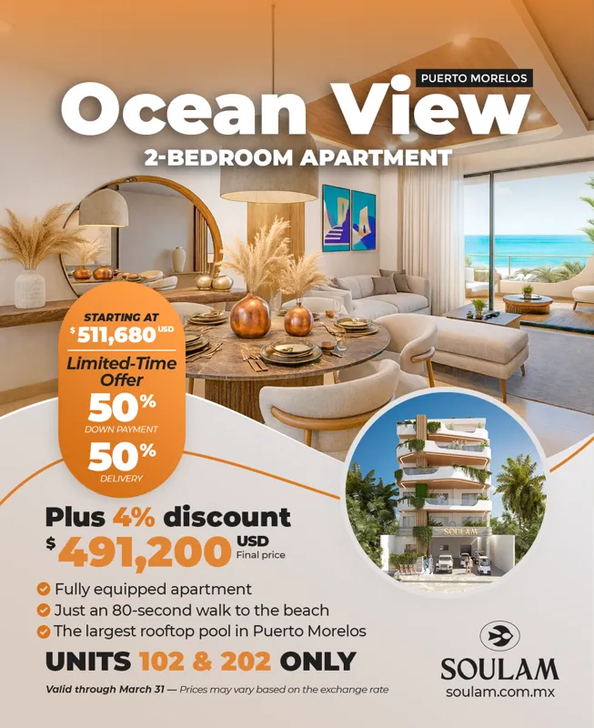 Update: Soulam, located just 80 seconds from the beach in Puerto Morelos, is set to begin construction in April 2025 with delivery scheduled for November 2026. The project features a total of 20 units, including 9 studios, 4 one-bedroom, 5 two-bedroom apartments, and 2 penthouses. Discover its amenities, finishes, and more in this comprehensive overview.