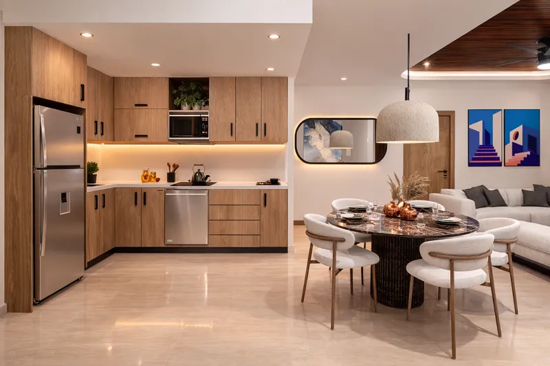A beautifully rendered image of a modern, open-concept living and dining area in a Soulam residence, featuring a round marble-top dining table with six contemporary chairs, a large concrete pendant lamp, and a sleek wooden ceiling accent. In the b...