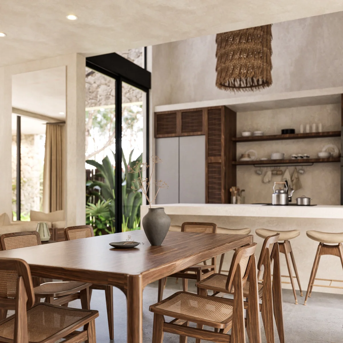 The Pitaya property embodies the essence of luxurious modernism, where sleek lines, minimalist styling, and a sophisticated neutral color palette converge to create a serene and inviting ambiance. The masterful handling of light is a hallmark of the design, with a harmonious blend of soft, warm artificial sources and gentle natural light that beautifully accentuates the rich textures of the wood, stone, and plush textiles. Every element, from the Japandi and Wabi-Sabi-inspired aesthetic to the meticulous attention to detail in the high-end finishes, contributes to an atmosphere of calm luxury, perfectly capturing the essence of a tranquil retreat that effortlessly blends modern design with natural elements.